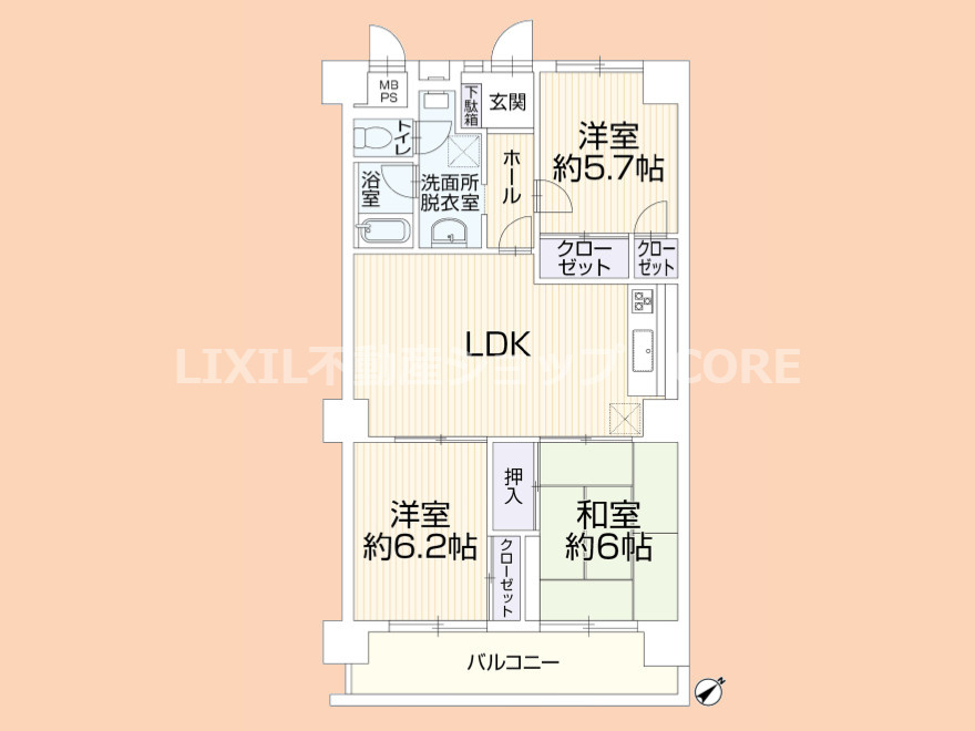 LDK / 和室 6.0帖 / 洋室 6.2帖 / 洋室 5.7帖 / |