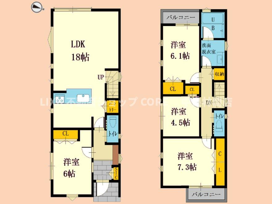 LDK 18.0帖 / 洋室 6.0帖 / 洋室 6.0帖 / 洋室 4.5帖 / 洋室 7.3帖 / |