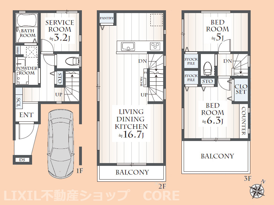 LDK 16.7帖 / 洋室 6.3帖 / 洋室 5.0帖 / S(納戸) 3.2帖 / |