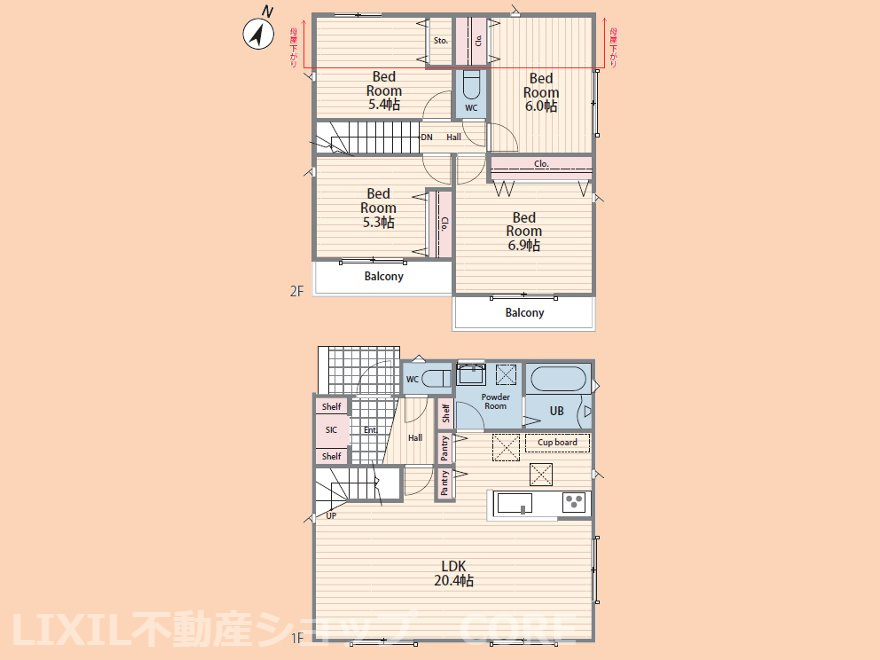 LDK 20.4帖 洋室 6.9帖 洋室 6.0帖 洋室 5.4帖 洋室 5.3帖 |