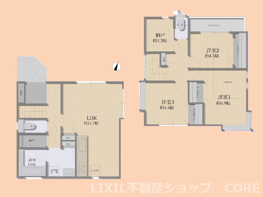 LDK 11.7帖 / 洋室 6.9帖 / 洋室 4.5帖 / 洋室 4.3帖 / S(納戸) 2.3帖 / |
